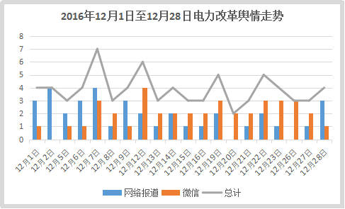 電力改革網(wǎng)絡輿情熱點監(jiān)測中,據(jù)中電傳媒電力傳媒數(shù)據(jù)研發(fā)中心監(jiān)測數(shù)據(jù)顯示:2016年12月1日至2016年12月28日有關(guān)電力改革的相關(guān)報道77篇,(與本電力傳媒數(shù)據(jù)研發(fā)中心11月份匯總的電力改革報道相比減少19篇),其中網(wǎng)絡報道37篇,微信40篇。