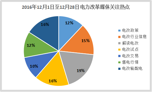 中電傳媒電力傳媒數(shù)據(jù)研發(fā)中心通過對2016年12月1日至2016年12月28日電力改革的媒體關(guān)注熱點進行統(tǒng)計,主要包括電改政策、電改行業(yè)信息、解讀電改、電改試點、電力交易、售電行情、電改輸配電七個領(lǐng)域,其中解讀電改占到了20%,電改試點、電改輸配電各占到了16%。2016年的年終歲尾,社會各界將目光集中到一年來電力改革的年終解讀與總結(jié)上,2016年,輸配電價改革落地生根、電力體制改革綜合試點次第開花、配售電側(cè)改革引爆市場,電改試點已覆蓋全國29個省(區(qū)、市)和新疆生產(chǎn)建設兵團,為進一步建設完善的電力市場提供了發(fā)展空間。