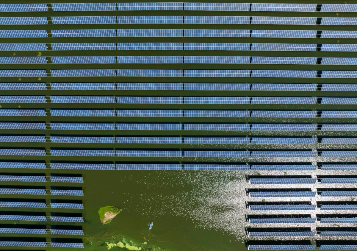 8月15日,電力志愿者在江蘇泰州興化市千垛鎮(zhèn)“漁光互補(bǔ)”光伏發(fā)電項(xiàng)目基地巡檢。
