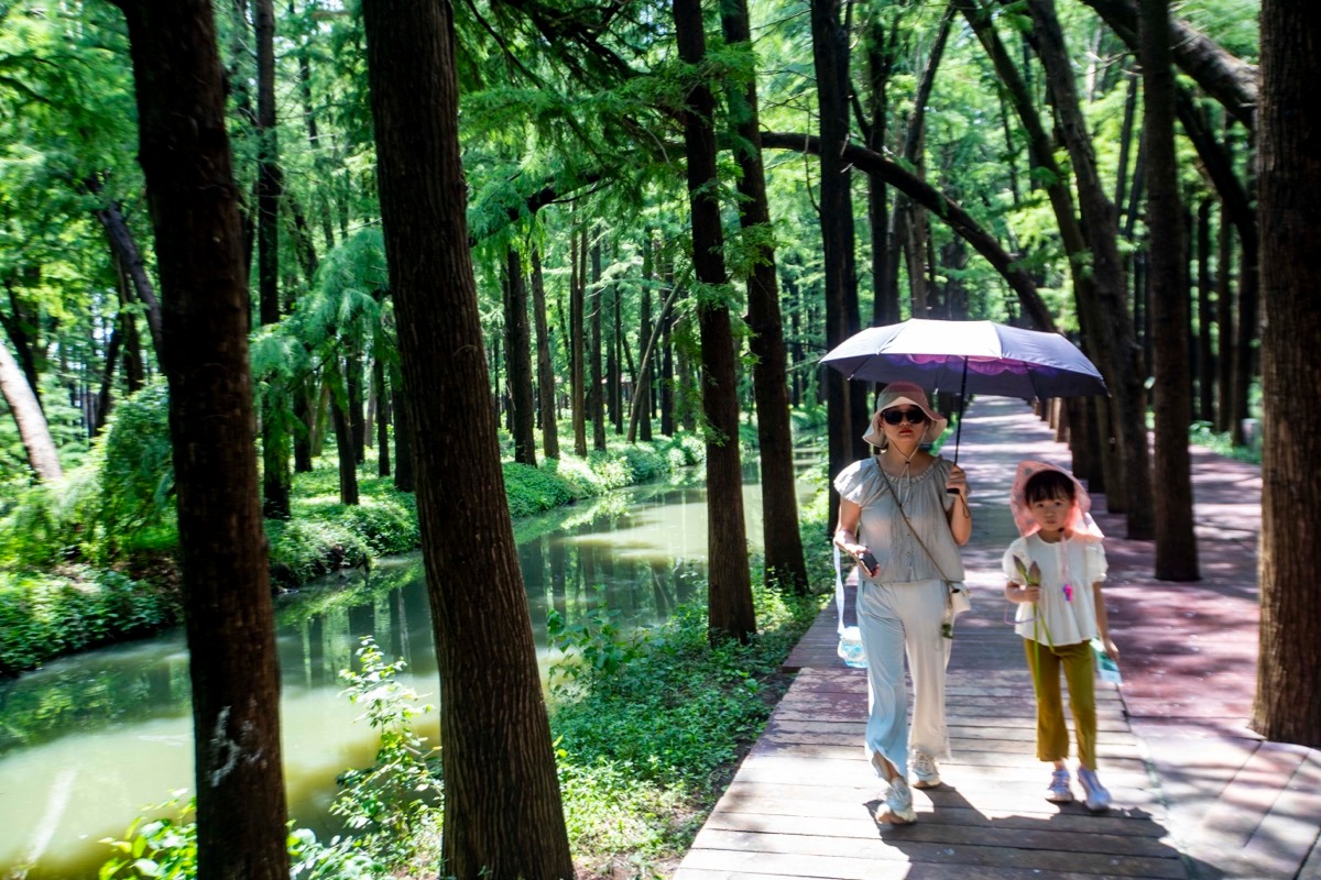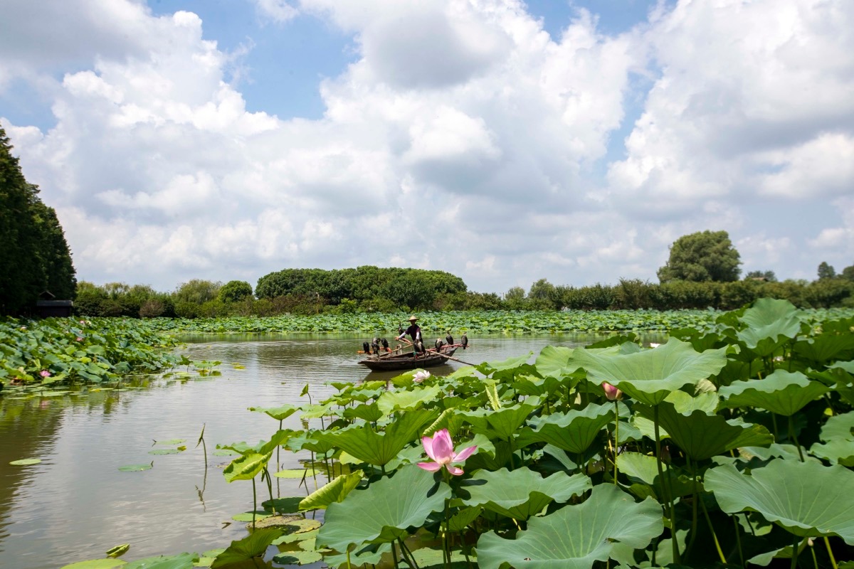8月15日,游客在江蘇泰州興化市里下河國家濕地公園游玩。
