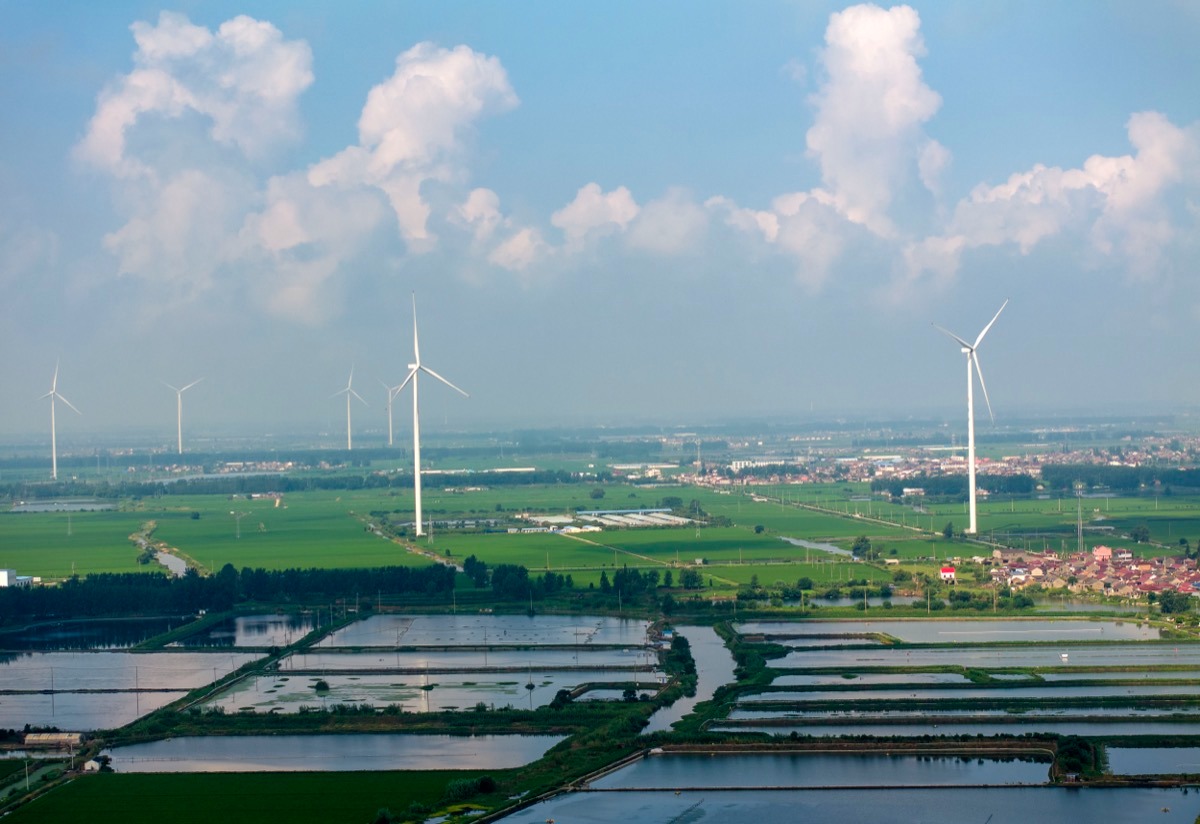 8月15日,在江蘇泰州興化市經(jīng)濟(jì)開發(fā)區(qū)拍攝的風(fēng)電與田野、藍(lán)天白云相映成趣。
