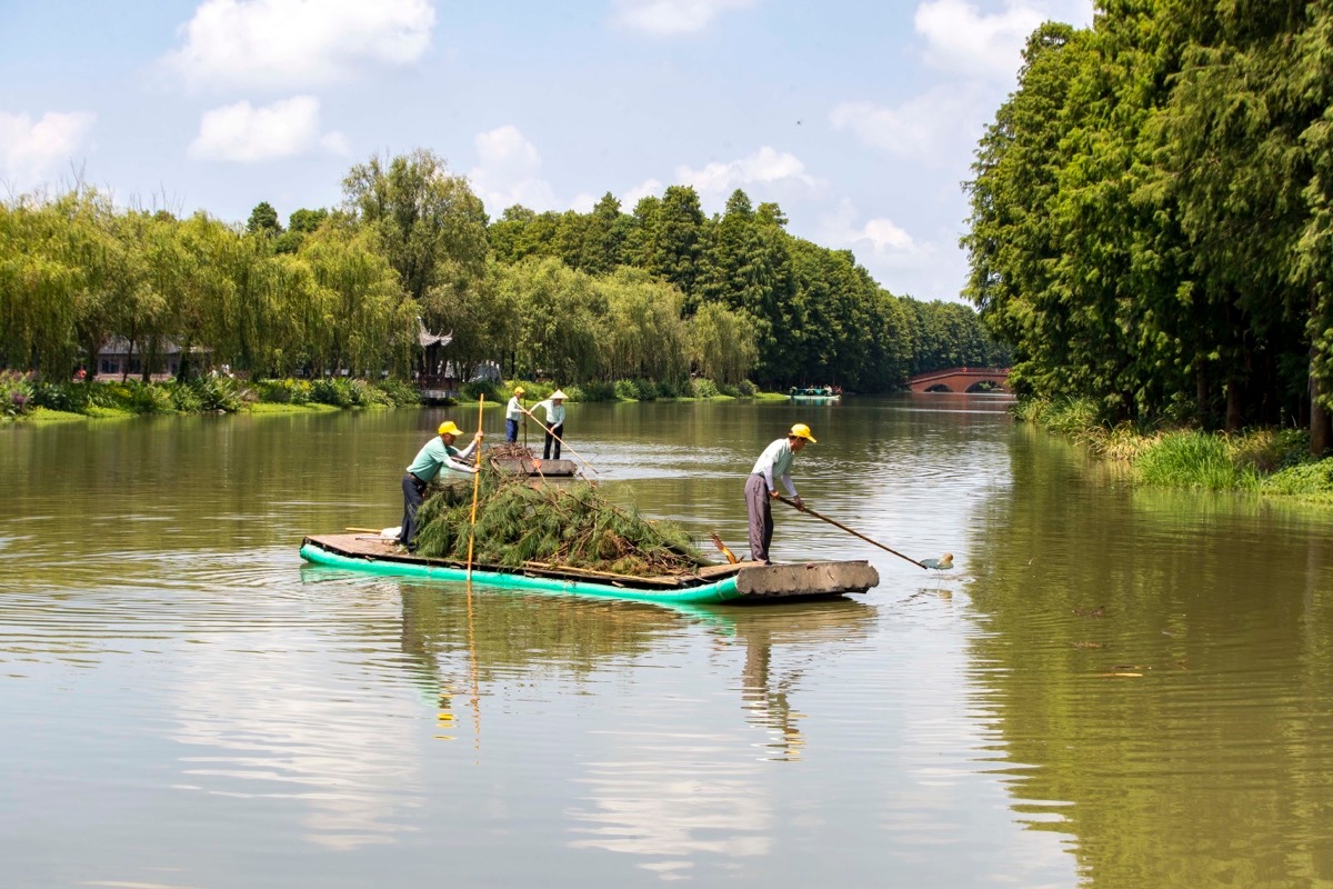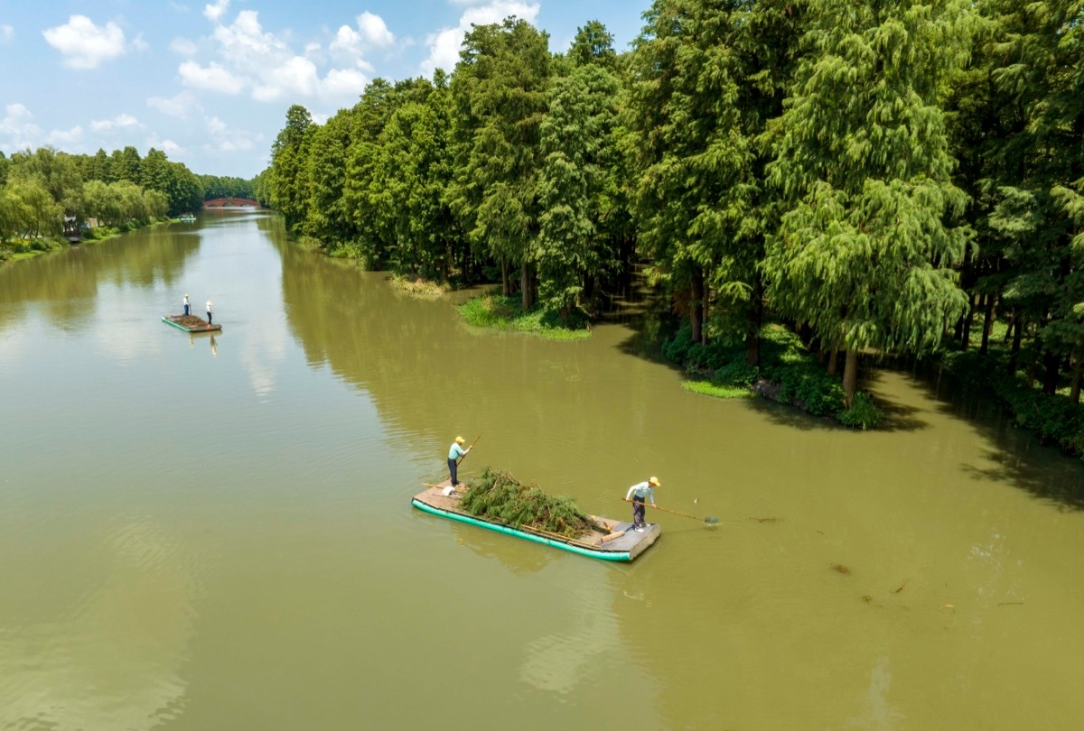 8月15日,志愿者在江蘇泰州興化市里下河國家濕地公園清理水面垃圾。