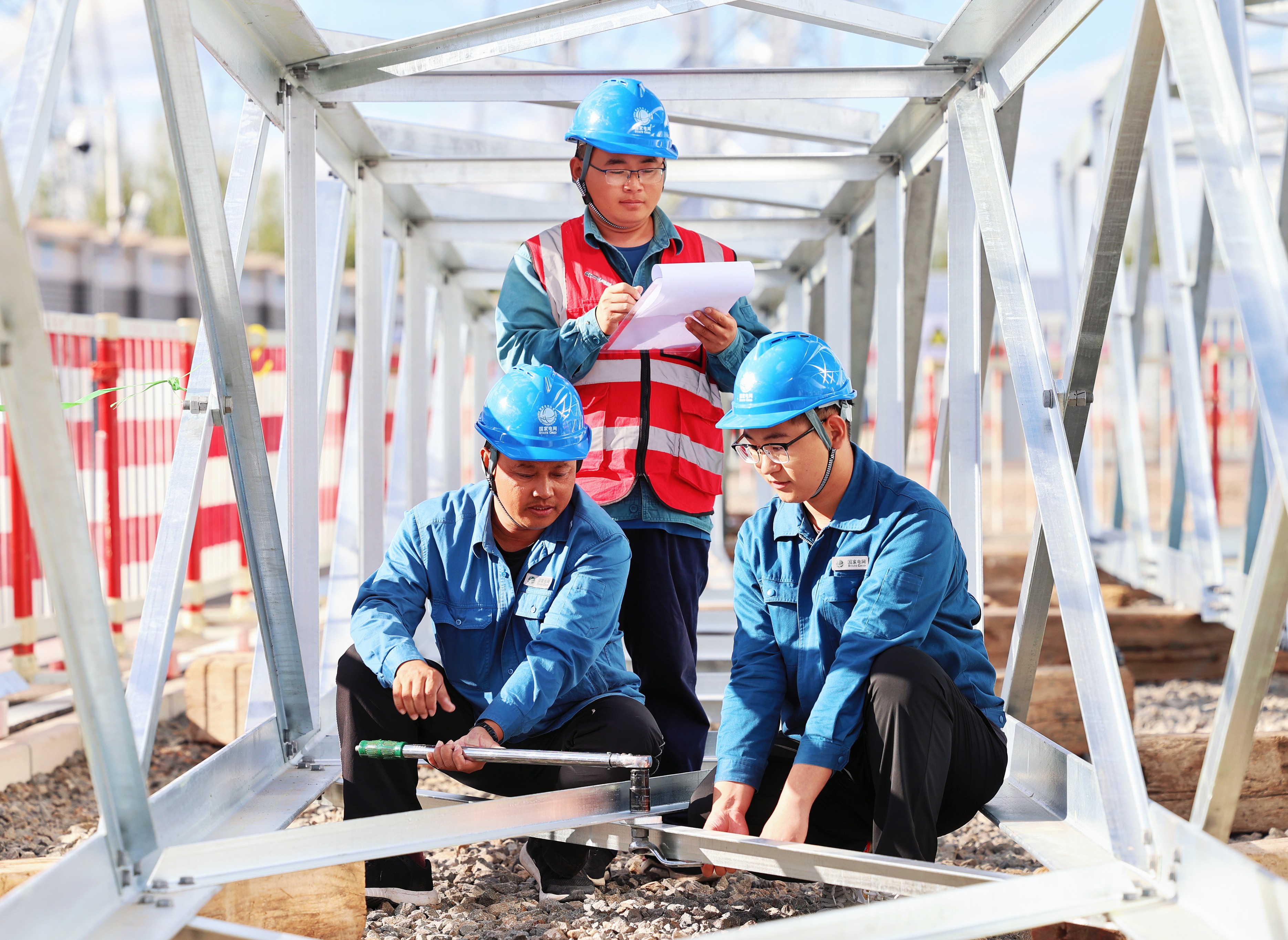 8月22日,由國網(wǎng)山東送變電工程有限公司參建的錫盟1000千伏變電站擴建工程施工現(xiàn)場,該公司員工對組裝完成的#13避雷針進行螺栓力矩檢查。該避雷針為本工程第二組避雷針,高60米,總重13.1噸。(李翔 攝)