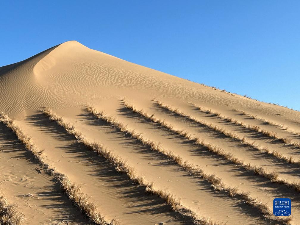 這是光伏方陣外圍布設(shè)的草方格沙障。(圖片來源:中國電建水電七局)