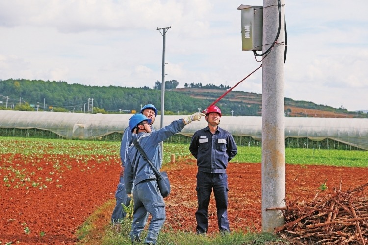 云南電網(wǎng)公司紅河瀘西供電局金馬供電所工作人員檢查小香蔥種植戶計(jì)量裝置。