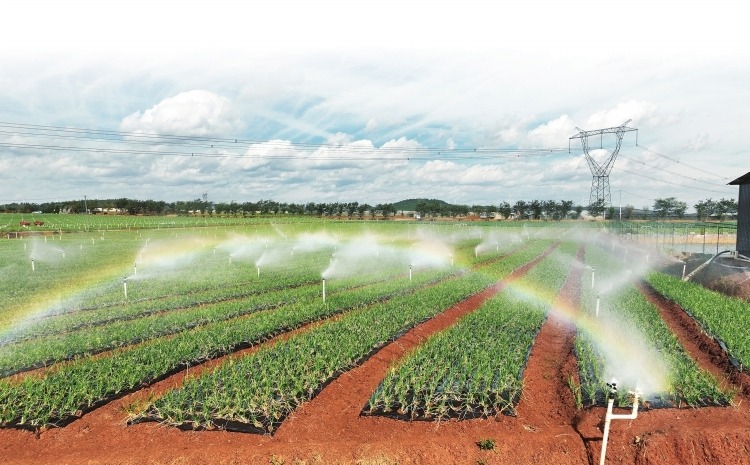 種植基地里的水肥一體化灌溉系統(tǒng)正在對(duì)小香蔥進(jìn)行噴灌。
