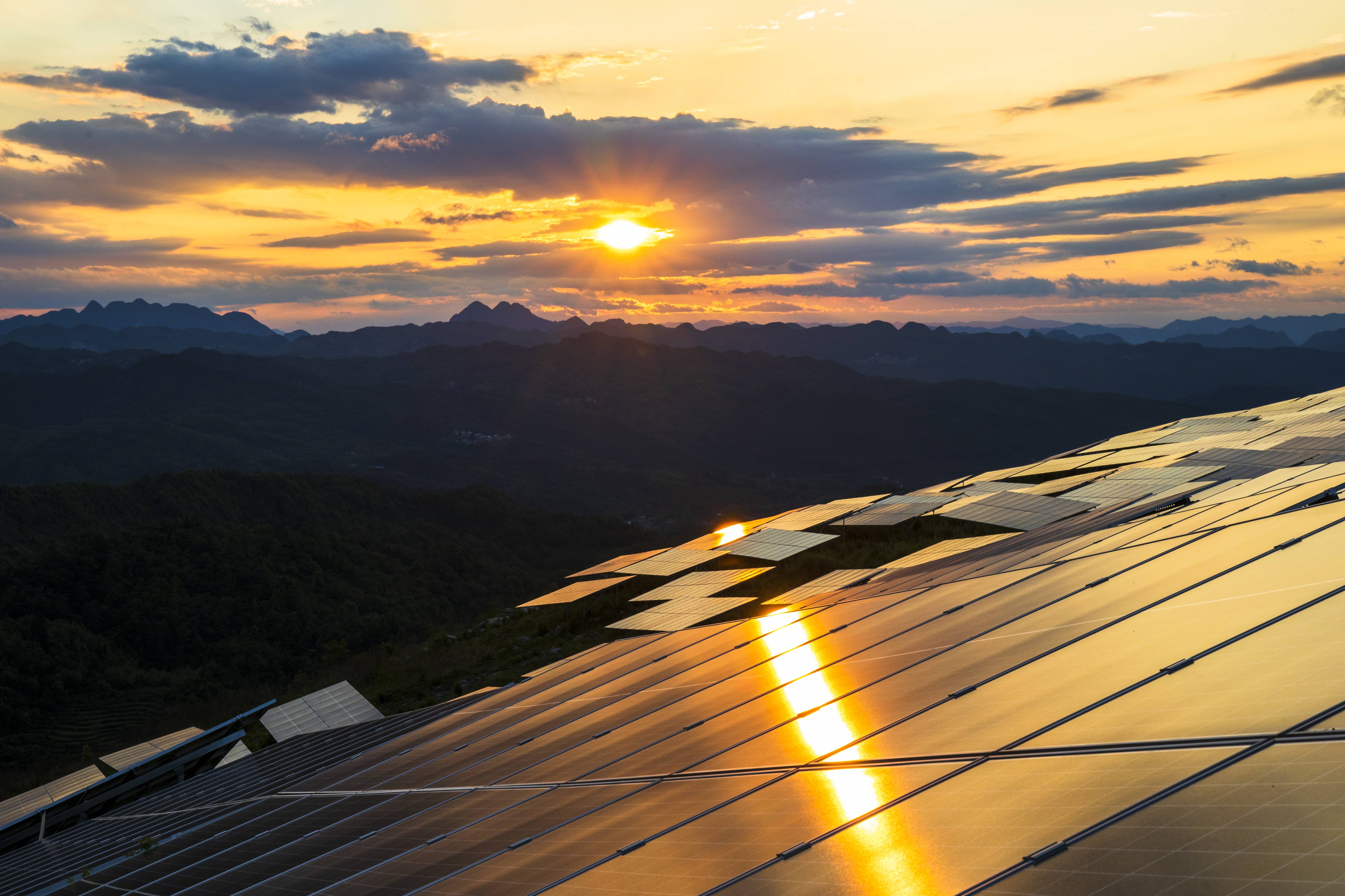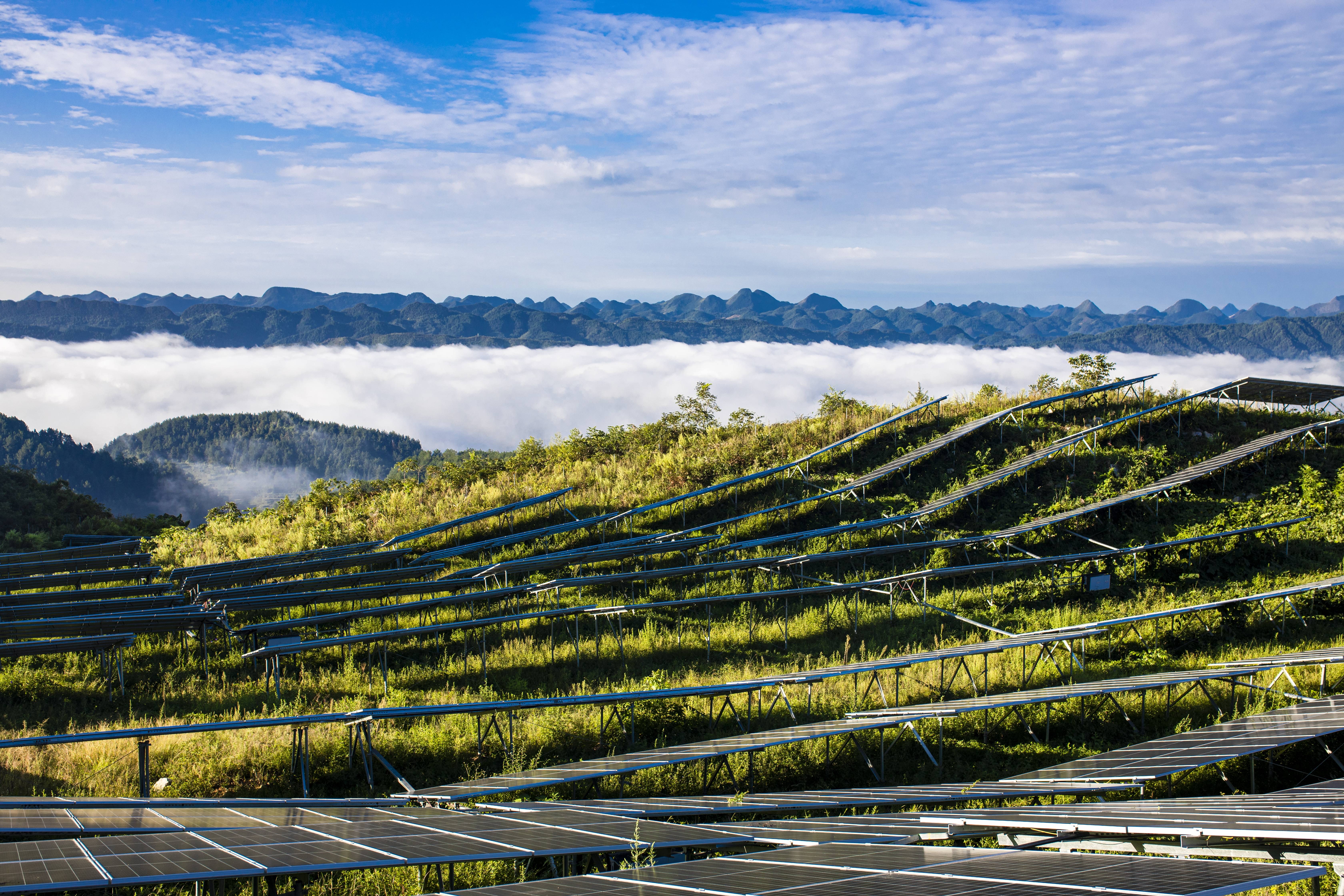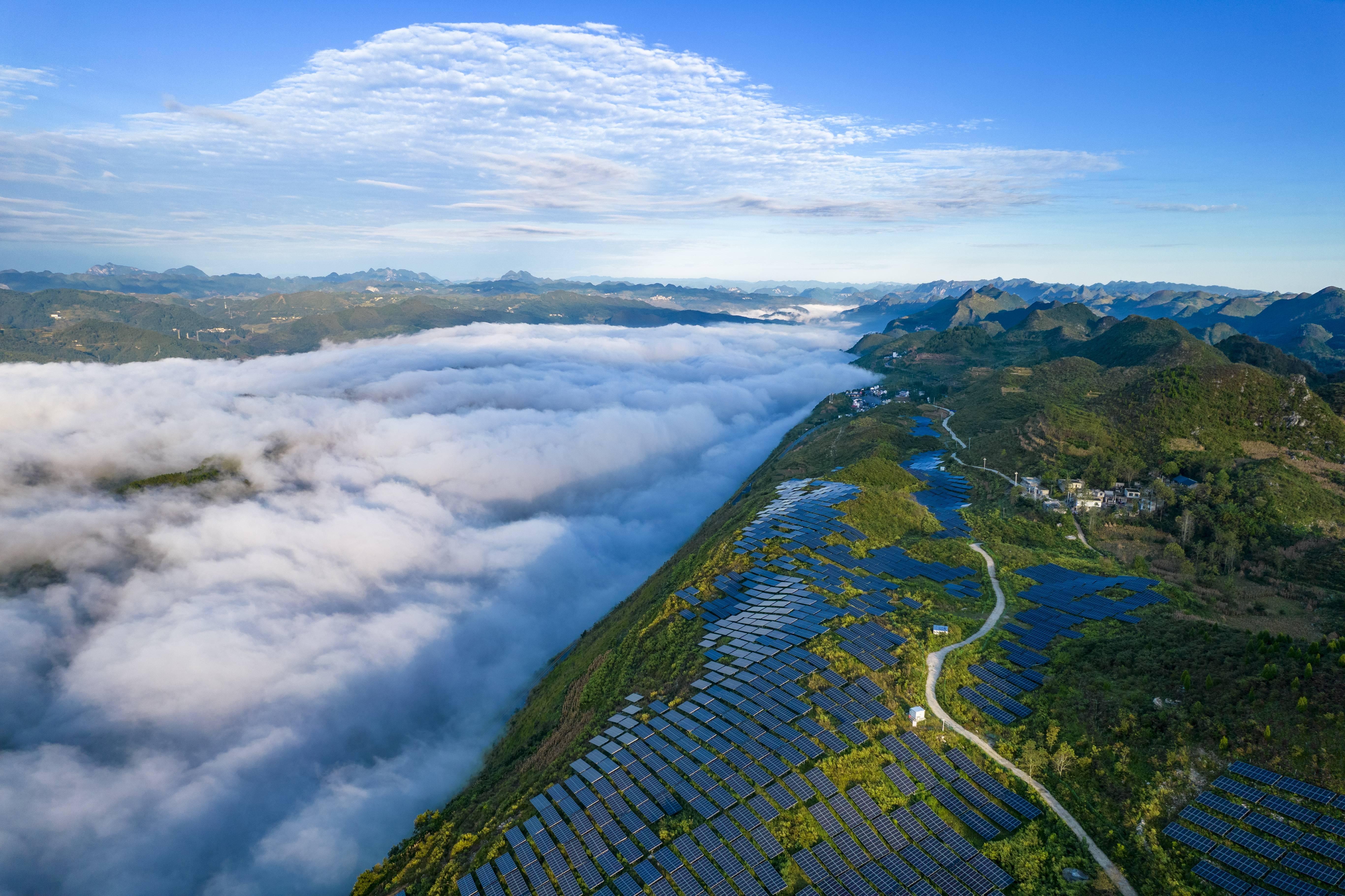 早晨云海彌漫,晨光中光伏板如同大地的片片鎧甲。