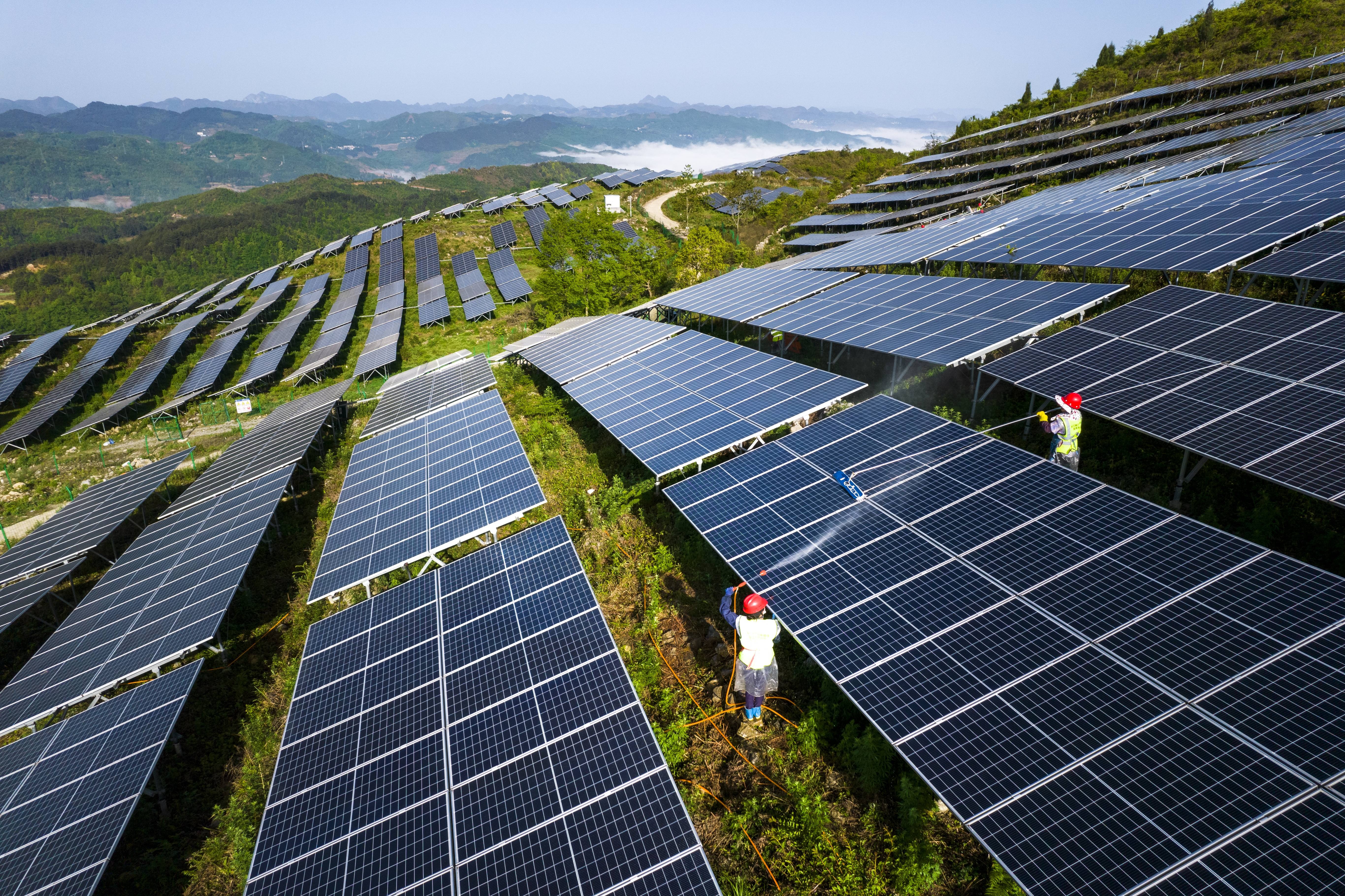 近景中工人在清洗光伏板,以提高發(fā)電效率。遠處,早晨的云海開始彌漫。
