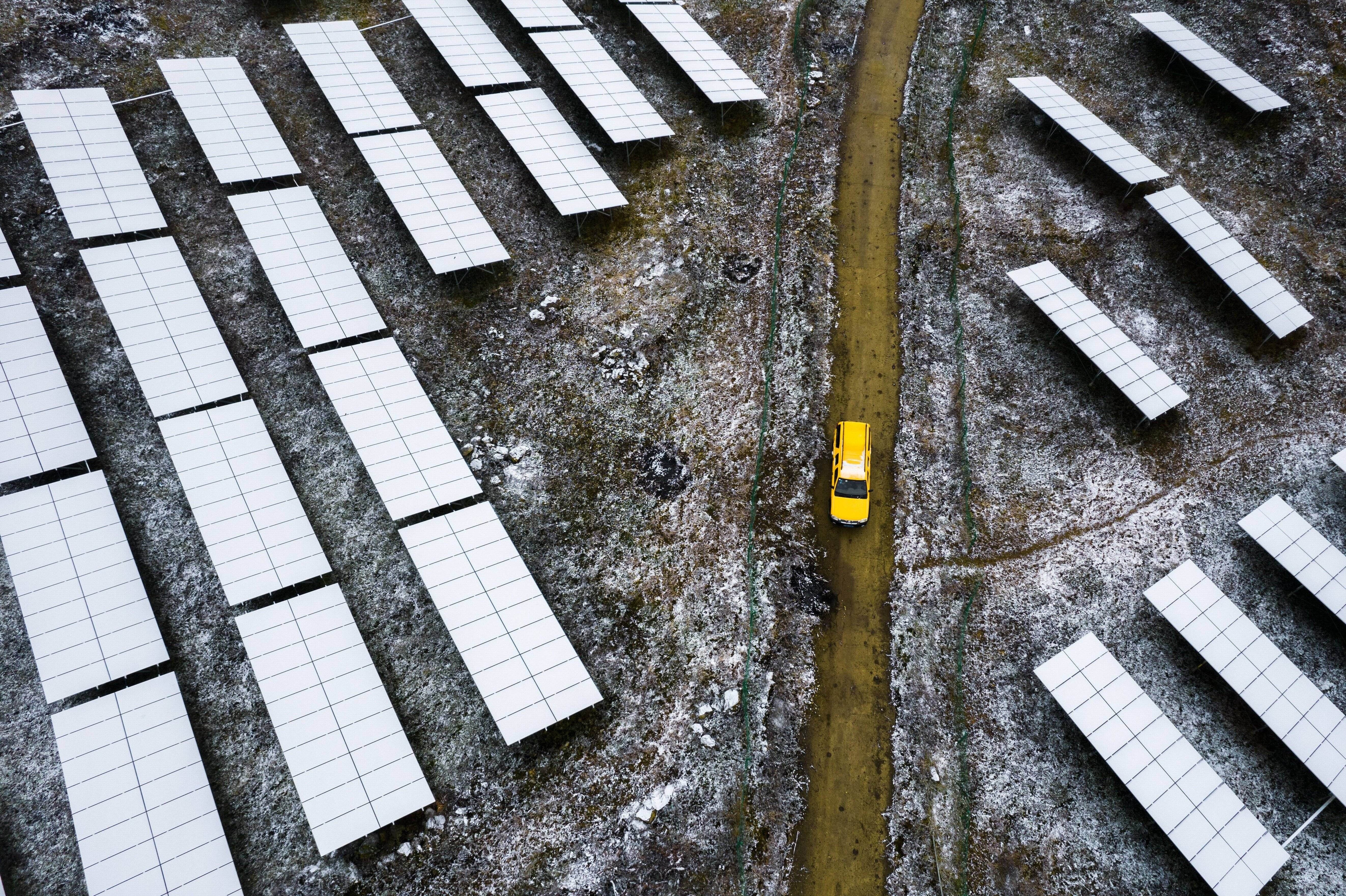 電力搶修車駛過落滿積雪的光伏項目基地。