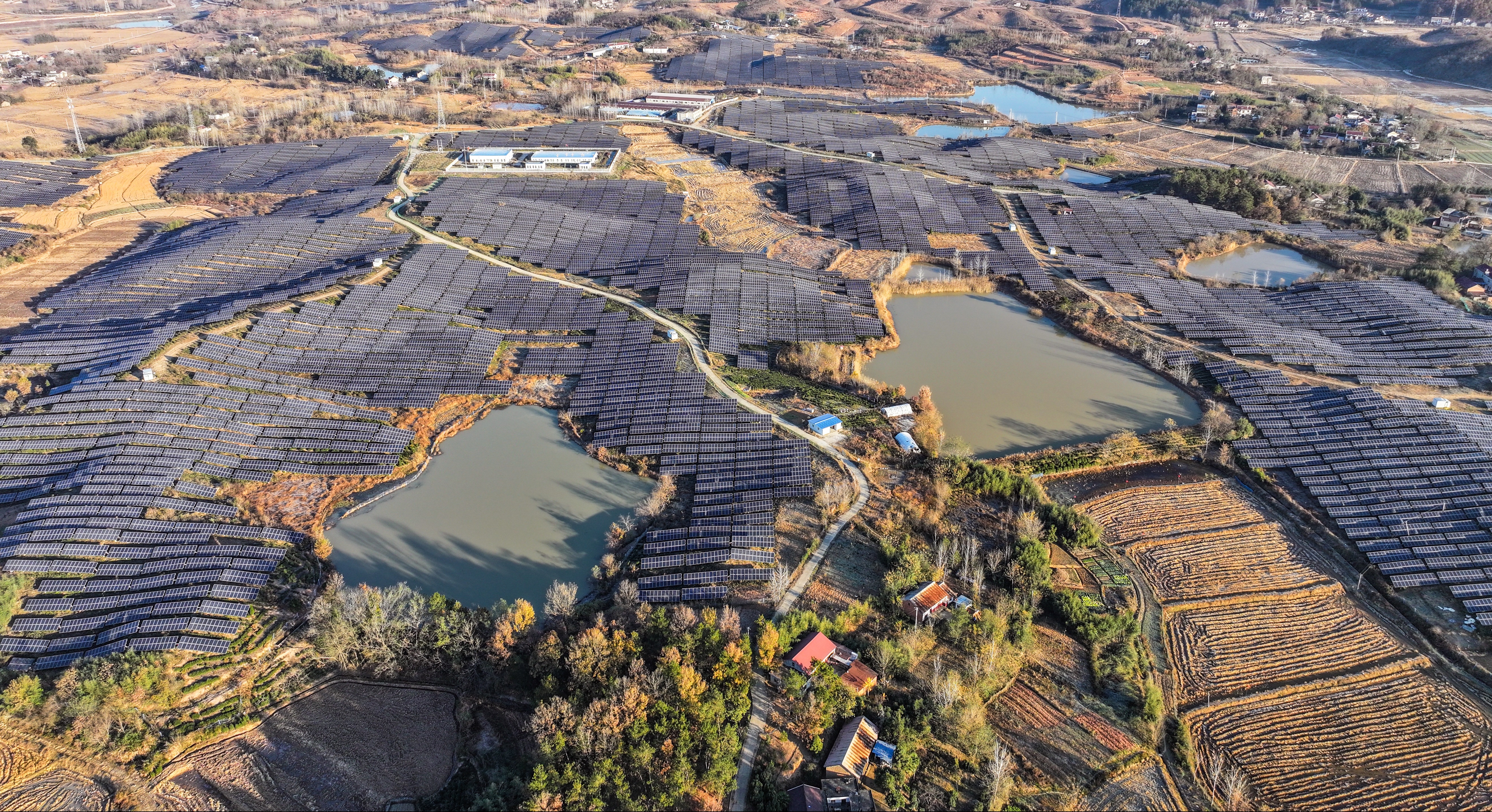 該電站2016年初并網(wǎng)發(fā)電,裝機(jī)容量10萬千瓦,在4000多畝荒地上開墾“種電”,發(fā)展“陽光經(jīng)濟(jì)”,2023年截至目前已發(fā)電1.5億余千瓦時。