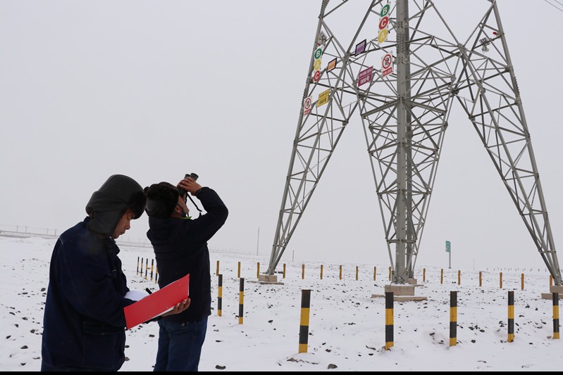 12月13日,國網(wǎng)哈密供電公司輸電運(yùn)維人員對110千伏山馬線進(jìn)行特殊巡視。(馮洋攝)