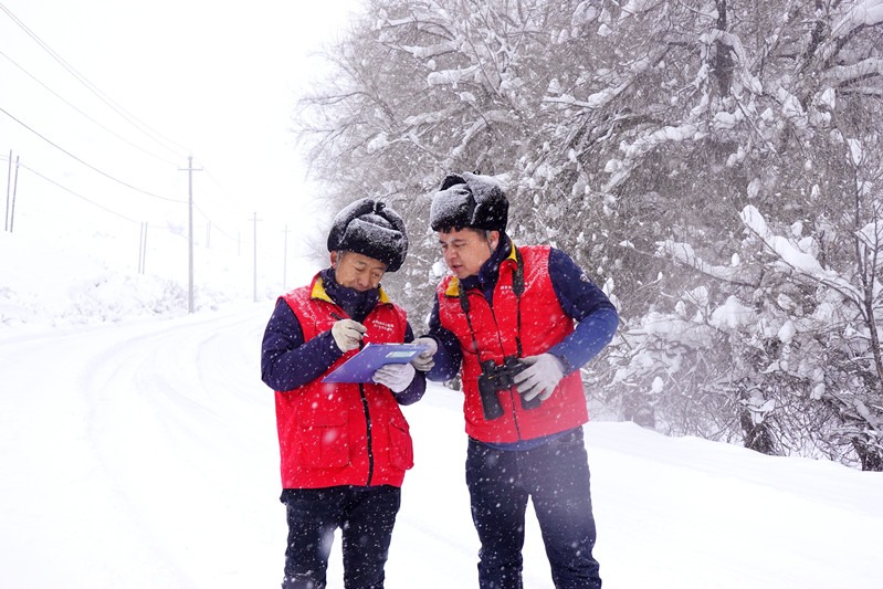 12月13日,國網(wǎng)阿勒泰供電公司喀納斯供電所黨員服務(wù)隊(duì)對重點(diǎn)保電線路10千伏云禾線開展雪后特巡。(明庭俊杰攝)