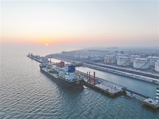 圖為在曹妃甸油庫碼頭,“長(zhǎng)吉洲”號(hào)進(jìn)行原油裝船作業(yè)。