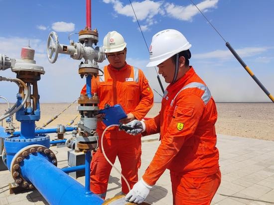 技術(shù)人員在國(guó)內(nèi)首個(gè)多介質(zhì)、多材質(zhì)、多尺寸輸氫管道試驗(yàn)測(cè)試平臺(tái)開(kāi)展巡檢。楊有為攝