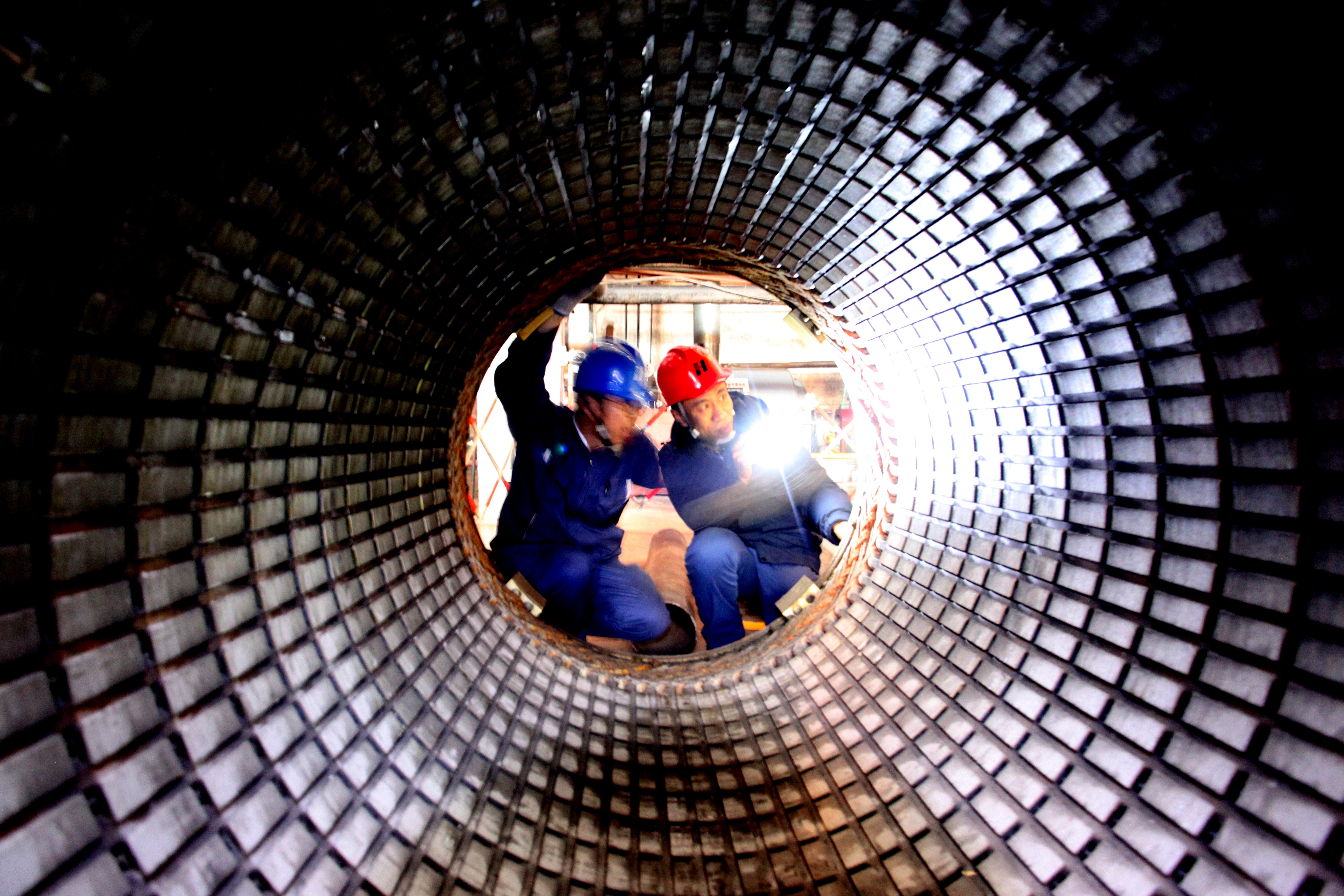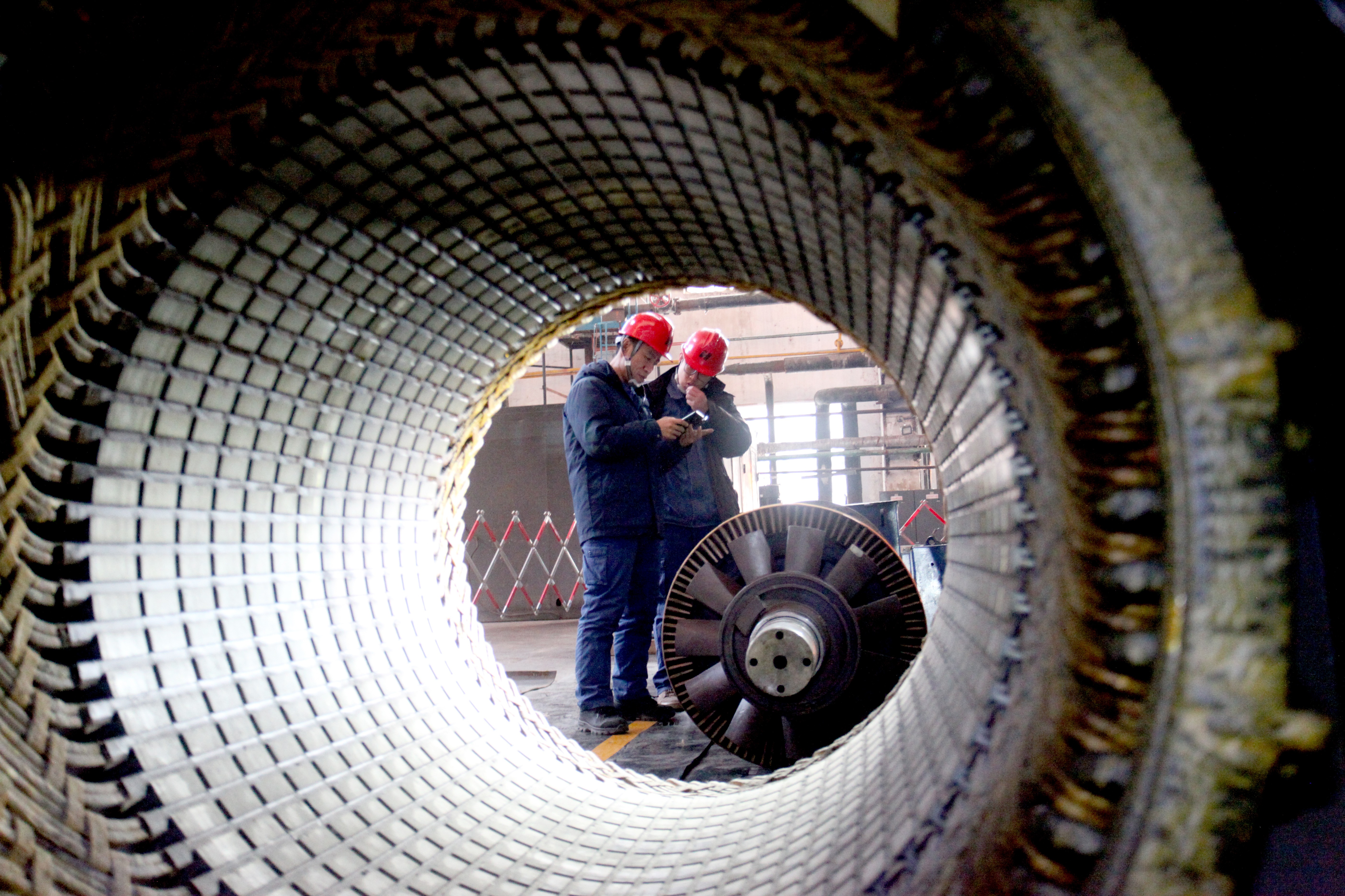 圖為,黨委書(shū)記趙慶春與電氣技術(shù)人員查找風(fēng)力發(fā)電機(jī)電機(jī)事故點(diǎn)。
