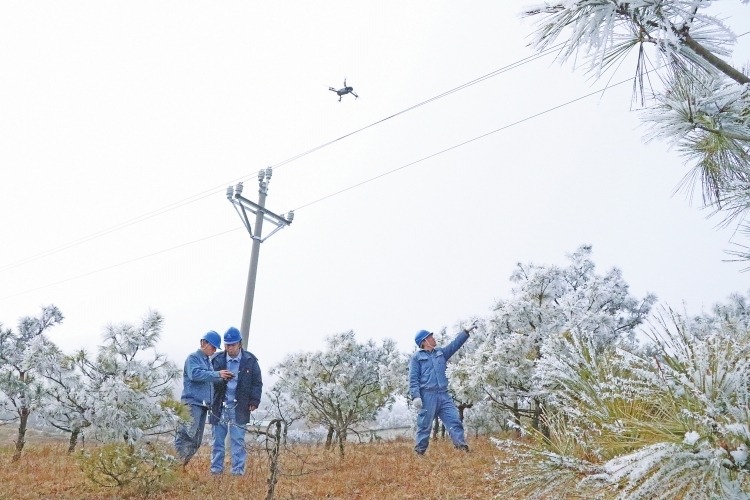 云南電網(wǎng)公司昭通魯?shù)楣╇娋铸垬涔╇娝ぷ魅藛T通過無人機(jī)對覆冰區(qū)10千伏轉(zhuǎn)山包線開展特巡觀冰工作。馬立俊 攝