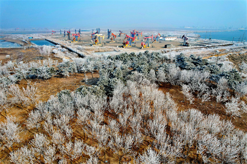 2月19日,冀東油田陸上作業(yè)區(qū)生產(chǎn)平臺周圍的樹木掛滿白霜,蔚為壯觀。