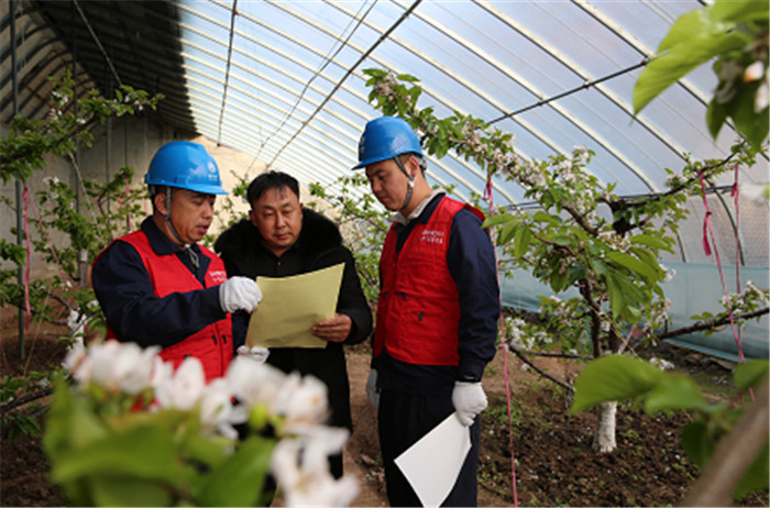 國網(wǎng)山東威海供電公司員工在櫻桃冬暖大棚內(nèi)檢查灌溉設(shè)備用電情況。