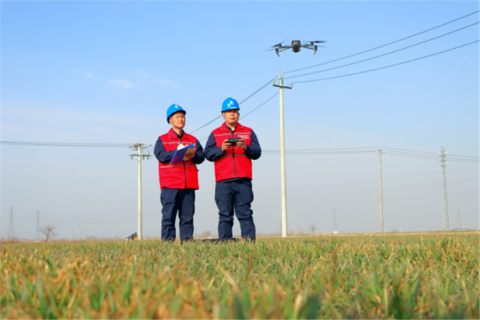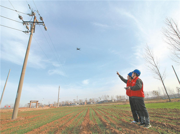 國網(wǎng)河北石家莊供電公司員工在無極縣七汲村用無人機(jī)巡檢輸電線路,保障村民春灌安全用電。