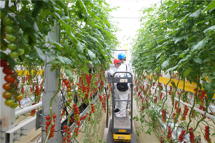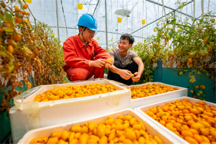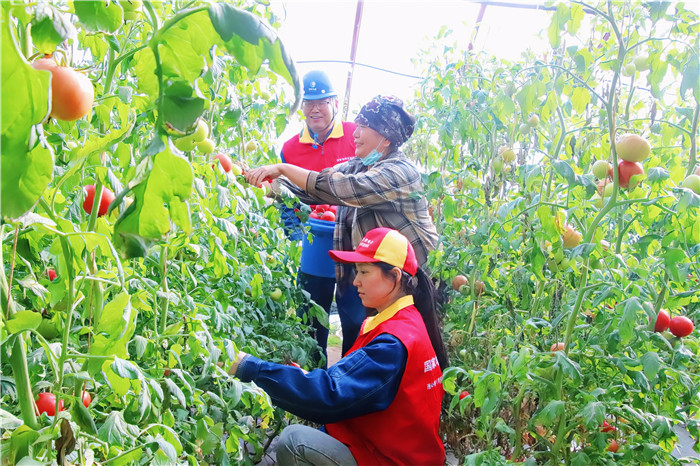 國網(wǎng)浙江麗水供電公司員工在蔬菜大棚幫助農(nóng)戶挑揀番茄。