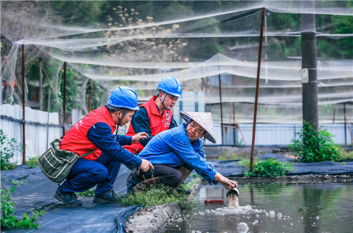 國網(wǎng)福建龍巖供電公司員工在新羅區(qū)龍門鎮(zhèn)湖坑村“福香占”稻魚綜合種養(yǎng)示范點(diǎn)了解客戶用電需求。