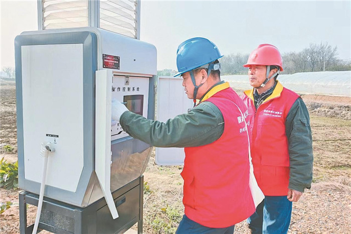 國家電網(wǎng)江蘇電力共產(chǎn)黨員服務(wù)隊(duì)隊(duì)員來到漣水縣紅窯鎮(zhèn)春竺蘆筍產(chǎn)業(yè)園,幫助客戶排查用電安全隱患。