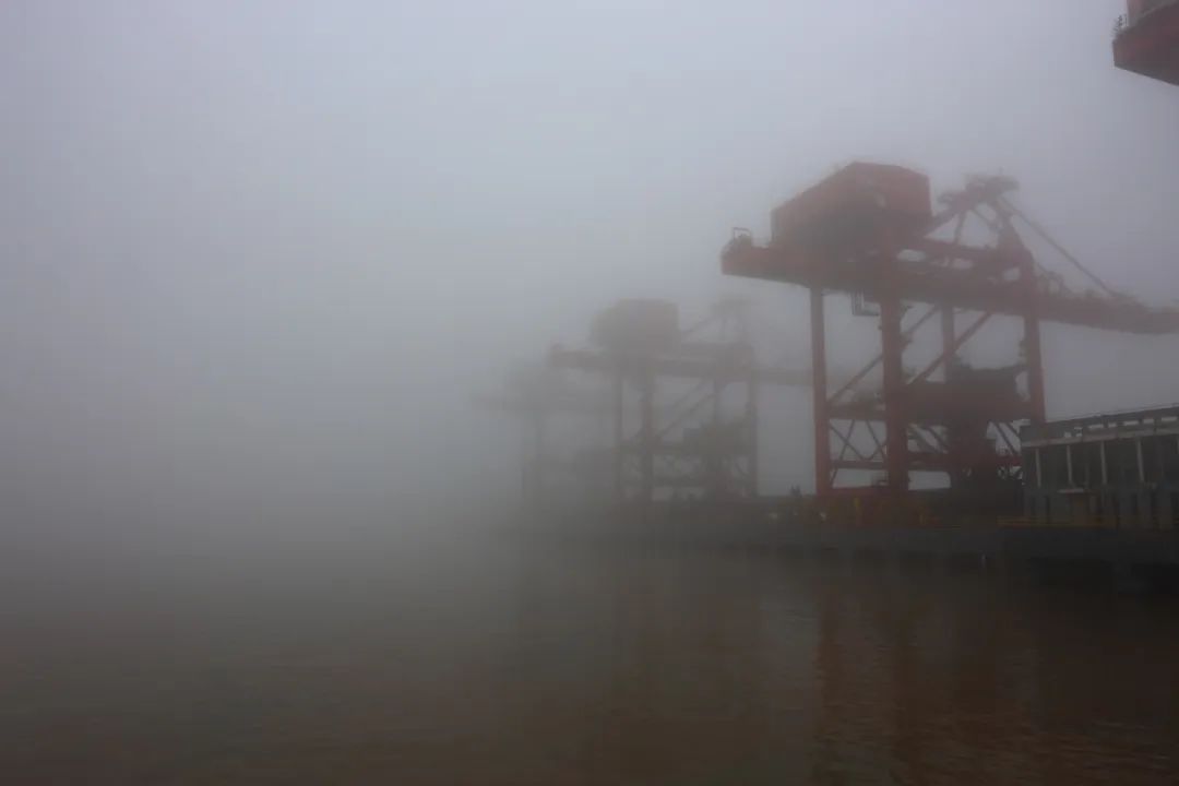 浙能港口港區(qū)大霧彌漫,如同一塊巨大的幕布。