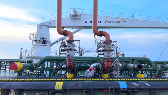 應(yīng)急值守船對靠妥的原油船執(zhí)行安全警戒任務(wù)。