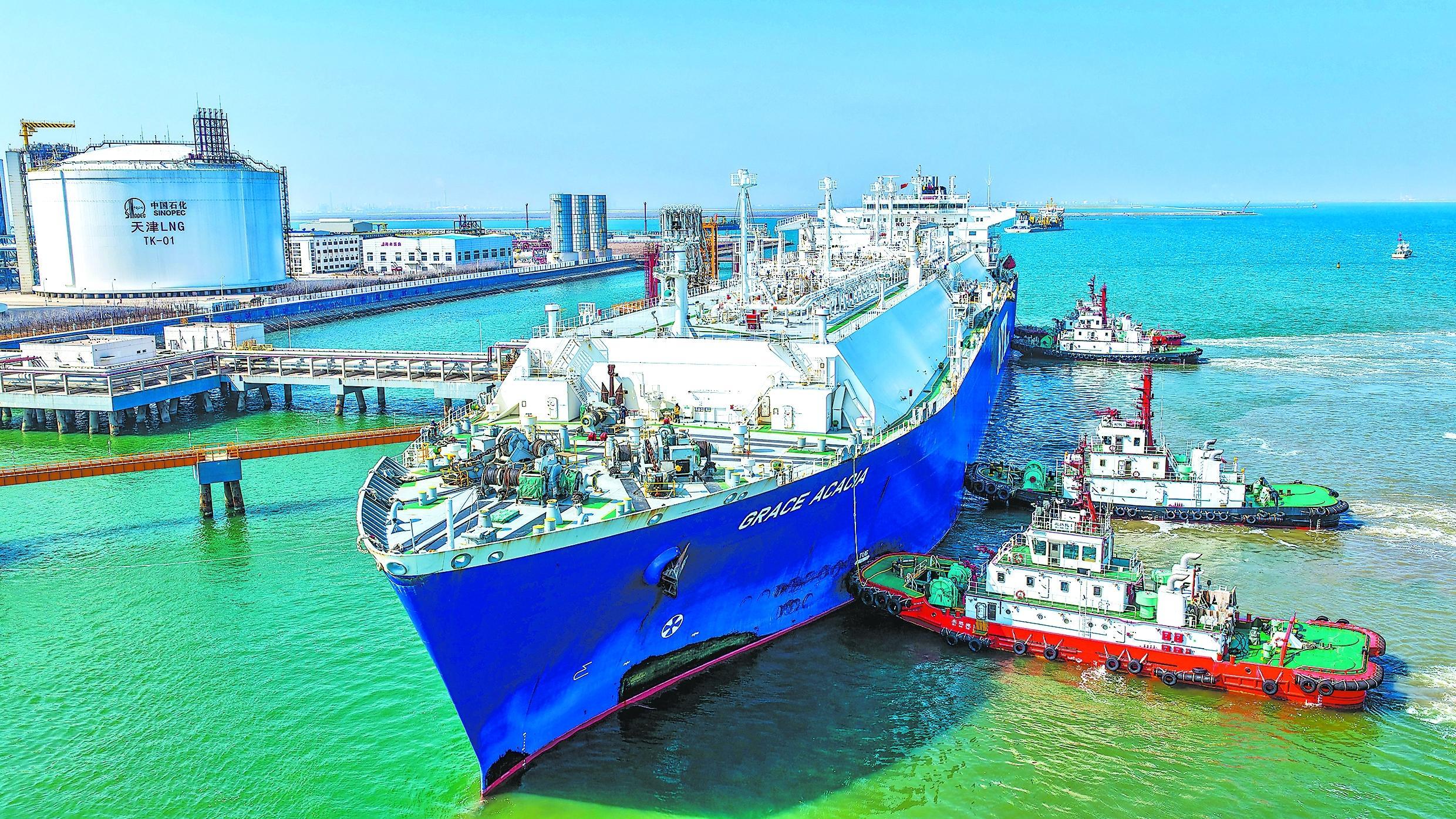 圖為3月15日“阿卡西亞”號LNG運輸船靠泊天津LNG接收站。(王軍攝)