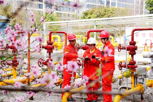 3月16日,初春的重慶春意盎然。西南油氣田公司重慶氣礦江北采輸氣作業(yè)區(qū)采氣工崔劍與管理人員,手持平板通過數(shù)據(jù)分析生產(chǎn)狀況,確保供氣安全穩(wěn)定。