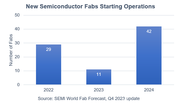 《世界晶圓廠預(yù)測(cè)報(bào)告》顯示,從2022年至2024年,全球半導(dǎo)體行業(yè)計(jì)劃開始運(yùn)營(yíng)82個(gè)新的晶圓廠,其中包括2023年的11個(gè)項(xiàng)目和2024年的42個(gè)項(xiàng)目,晶圓尺寸從300mm到100mm不等。