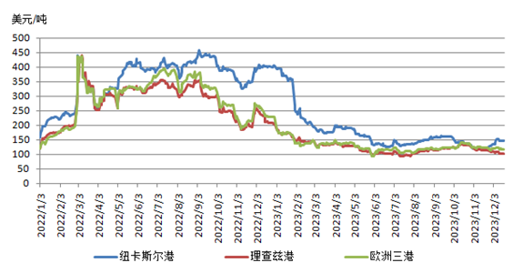 德國(guó)天氣寒冷煤炭消費(fèi)改善,促使歐洲市場(chǎng)煤炭?jī)r(jià)格指數(shù)上升超過(guò)120美元/噸。但整個(gè)歐洲的煤炭需求下降、天然氣儲(chǔ)備充足以及天然氣和電力價(jià)格下降,仍然是限制煤炭市場(chǎng)報(bào)價(jià)顯著上漲的主要影響因素。12月中旬,由于氣溫升高、供應(yīng)增加和天然氣價(jià)格下跌等因素,給煤炭市場(chǎng)報(bào)價(jià)持續(xù)帶來(lái)壓力,歐洲動(dòng)力煤市場(chǎng)價(jià)格指數(shù)大幅下降至112~115美元/噸的水平。而受歐洲需求疲軟和全球經(jīng)濟(jì)下滑趨勢(shì)的影響,南非高熱值6000大卡動(dòng)力煤價(jià)格持續(xù)下降,跌破100美元/噸關(guān)口,觸及4個(gè)月來(lái)的低點(diǎn)。
