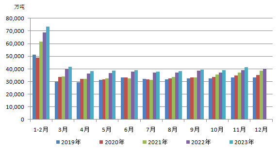 圖3 2019—2023年月度規(guī)模以上工業(yè)原煤產(chǎn)量