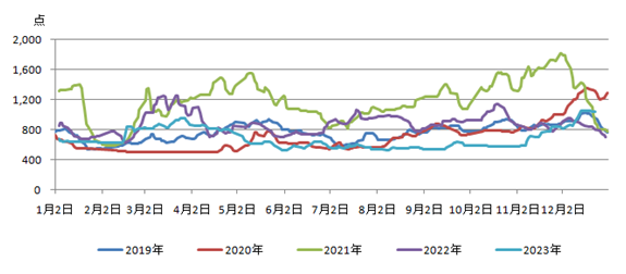2023年以來(lái),沿海海運(yùn)費(fèi)一路下行并長(zhǎng)期低位運(yùn)行。直到11月,一方面冷空氣活動(dòng)頻繁港口封航增多;另一方面因外貿(mào)行情向好,運(yùn)營(yíng)利潤(rùn)趕超內(nèi)貿(mào),兼營(yíng)船外流力度明顯加大,市場(chǎng)可用運(yùn)力有所減少,對(duì)內(nèi)貿(mào)行情起到積極作用,沿海運(yùn)費(fèi)開(kāi)啟上行。截至11月30日,煤炭海運(yùn)費(fèi)(秦皇島-廣州)44.7元/噸,海運(yùn)煤炭運(yùn)價(jià)指數(shù)OCFI報(bào)收于828.32點(diǎn),環(huán)比10月底上漲247.65點(diǎn),運(yùn)價(jià)漲幅明顯。
