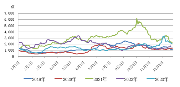 11月末至12月初,大西洋市場(chǎng)貨多船少拉動(dòng)日租金大幅上漲,創(chuàng)下年內(nèi)新高。受此影響,波羅的海干散貨運(yùn)價(jià)指數(shù)(BDI指數(shù))連續(xù)8個(gè)工作日快速上漲,12月4日,BDI指數(shù)報(bào)收于3346點(diǎn),創(chuàng)2022年6月以來(lái)新高。隨后,海岬型船太平洋市場(chǎng)貨盤(pán)平穩(wěn),巴西遠(yuǎn)程礦航線(xiàn)持續(xù)轉(zhuǎn)弱;巴拿馬型船及超靈便型船市場(chǎng)需求略有轉(zhuǎn)弱,市場(chǎng)情緒降溫,所有船型運(yùn)價(jià)指數(shù)均出現(xiàn)下跌,BDI指數(shù)大幅回落后逐漸企穩(wěn)。12月22日BDI指數(shù)2094點(diǎn),周環(huán)比回落10.82%。