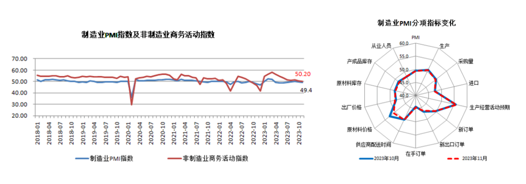 11月制造業(yè)采購(gòu)經(jīng)理指數(shù)(制造業(yè)PMI)回落0.1個(gè)百分點(diǎn)至49.4%,連續(xù)兩個(gè)月低于臨界值,經(jīng)濟(jì)恢復(fù)出現(xiàn)波折和反復(fù),經(jīng)濟(jì)企穩(wěn)向好基礎(chǔ)仍待鞏固。非制造業(yè)商務(wù)活動(dòng)指數(shù)(非制造業(yè)PMI)和綜合PMI產(chǎn)出指數(shù)環(huán)比分別下降0.4個(gè)百分點(diǎn)、0.3個(gè)百分點(diǎn)至50.2%、50.4%,均高于臨界點(diǎn),總體繼續(xù)保持?jǐn)U張,但擴(kuò)張速度繼續(xù)放緩。從供需分項(xiàng)指標(biāo)看,11月份供需指標(biāo)均環(huán)比下降,生產(chǎn)指數(shù)回落更多,導(dǎo)致制造業(yè)“生產(chǎn)和新訂單指數(shù)差”由上月的1.4%收窄至本月的1.3%,供需正缺口小幅回落,但仍處于較高水平,國(guó)內(nèi)供強(qiáng)需弱格局未變。預(yù)計(jì)受益于一攬子擴(kuò)內(nèi)需、穩(wěn)增長(zhǎng)政策落地顯效,未來(lái)國(guó)內(nèi)供需銜接作用將有所增強(qiáng),供需缺口有望運(yùn)行在低位區(qū)間。