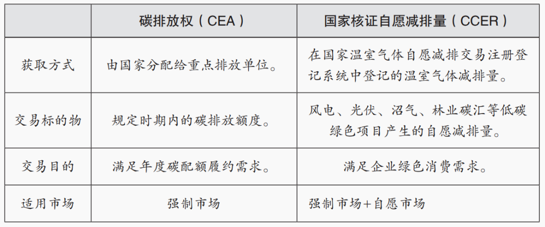 從履約形式和減排主體來(lái)看,CCER與CEA存在明顯區(qū)別。CEA是強(qiáng)制減排市場(chǎng),以碳配額為交易對(duì)象,相關(guān)主體必須完成履約指標(biāo)。而CCER則為一種市場(chǎng)化激勵(lì)手段,交易對(duì)象為風(fēng)電、光伏、沼氣、林業(yè)碳匯等低碳綠色項(xiàng)目產(chǎn)生的自愿減排量,相關(guān)主體可以將項(xiàng)目減排量通過(guò)市場(chǎng)交易實(shí)現(xiàn)環(huán)境價(jià)值變現(xiàn)獲得經(jīng)濟(jì)收益,可以看作是碳市場(chǎng)框架體系下對(duì)自愿減排主體的補(bǔ)償和獎(jiǎng)勵(lì)。