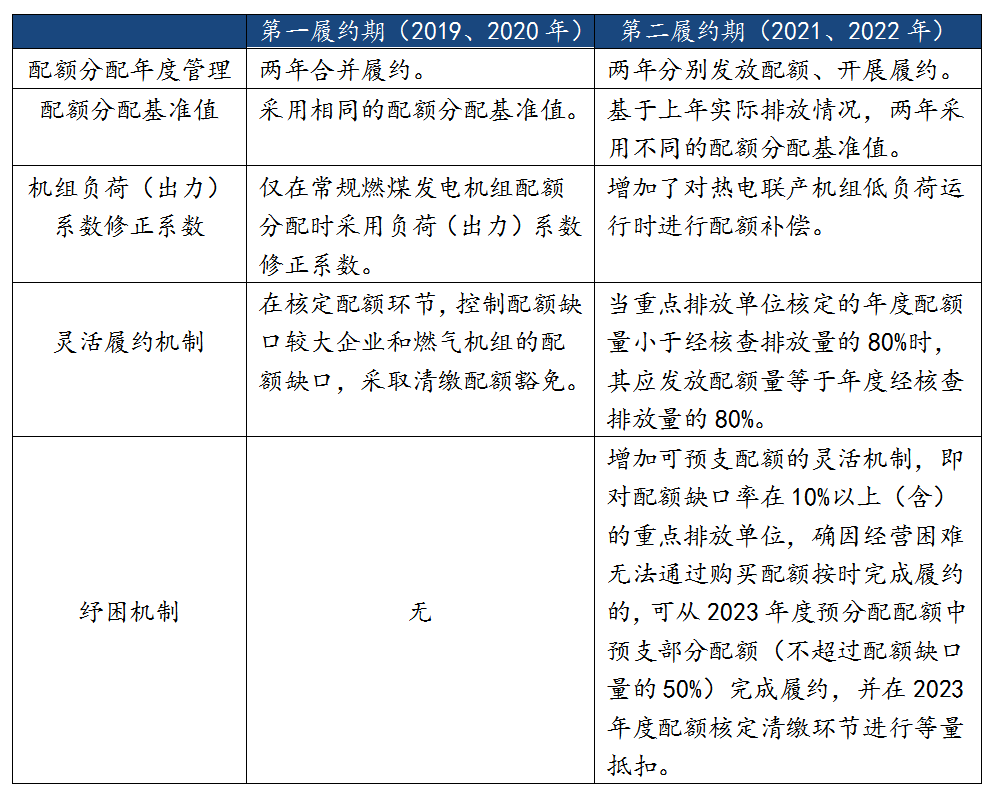 從運(yùn)行機(jī)制來(lái)看,第二個(gè)履約期基本沿襲了前一次的總體框架。例如,兩次碳市場(chǎng)的履約周期均為兩年,配額分配的覆蓋主體同為電力行業(yè),市場(chǎng)運(yùn)行采用強(qiáng)制市場(chǎng)的履約機(jī)制且以碳配額為交易標(biāo)的。在抵消機(jī)制上,重點(diǎn)排放單位每年可以使用國(guó)家核證自愿減排量抵消碳排放配額,但比例不得超過(guò)應(yīng)繳配額的5%。