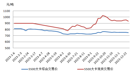 2023年國內(nèi)動力煤市場價格先抑后揚“V”型波動,波動幅度收窄,價格中樞回落。2023年秦皇島港動力煤年內(nèi)均價965元/噸,較2022年全年均價下降304元。一季度,受2月下旬內(nèi)蒙古阿拉善盟煤礦事故影響,國內(nèi)市場煤炭價格迅速上漲,但因供暖季接近尾聲,煤礦生產(chǎn)旺盛且進(jìn)口煤增加,煤炭價格持續(xù)下行走勢。二季度,國內(nèi)煤炭產(chǎn)量繼續(xù)增加,煤電企業(yè)以長協(xié)煤采購為主,市場煤價格持續(xù)偏弱運行。直至下半年,受事故影響安全檢查不斷加強,供應(yīng)有所收縮,動力煤市場價格企穩(wěn)并回升。特別是9月中下旬,產(chǎn)地坑口價格高位上漲,到港成本高企,北方港口動力煤市場因市場煤資源不足,同時部分終端用戶節(jié)前備貨需求釋放,貿(mào)易商情緒升溫,引發(fā)動力煤價格快速反彈上行。10月10日CECI曹妃甸指數(shù)5500大卡規(guī)格品報收于1033元/噸,達(dá)到了自年初下降以來的最高點。此后自10月中旬開始,終端高庫存與迎峰度冬預(yù)期持續(xù)博弈,下游用戶抵觸高價煤,港口市場煤銷售不佳,環(huán)渤海港口加快壘庫,港口煤價持續(xù)回落。12月29日CECI曹妃甸指數(shù)5500大卡規(guī)格品報收于926元/噸,下行收官2023年。