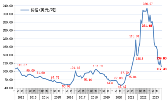 2022年全球普遍是暖冬,導(dǎo)致2023年西方國家煤炭維持高庫存,需求不足下庫存外溢,較多煤炭資源轉(zhuǎn)移到亞太地區(qū),并對國際煤炭價格持續(xù)構(gòu)成壓力。作為我國煤炭進(jìn)口第一大來源國印尼,其2023年煤炭產(chǎn)量達(dá)到7.75億噸,比2022年實際產(chǎn)量6.87億噸增長13%,其中出口5.18億噸。在來自中國及亞洲其他國家的需求支撐下,2023年印尼煤炭價格雖比較堅挺,但仍呈下行走勢。2023年12月份印尼動力煤(高位發(fā)熱量6322千卡/千克)參考價(HBA)為117.38美元/噸,比11月份價格139.80美元/噸下降22.42美元,環(huán)比下降16.04%;比2022年同期標(biāo)桿價格281.48美元/噸下降164.10美元,同比下降58.3%。