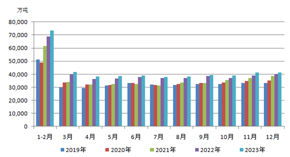 圖3 2019—2023年月度規(guī)模以上工業(yè)原煤產(chǎn)量