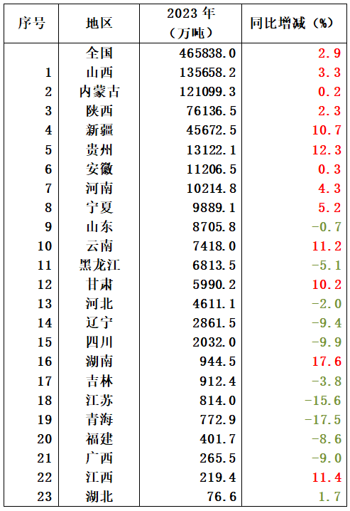 表1 2023年全國規(guī)模以上企業(yè)原煤產(chǎn)量(分地區(qū))