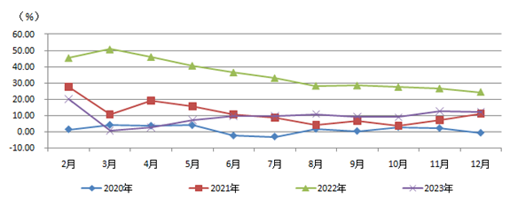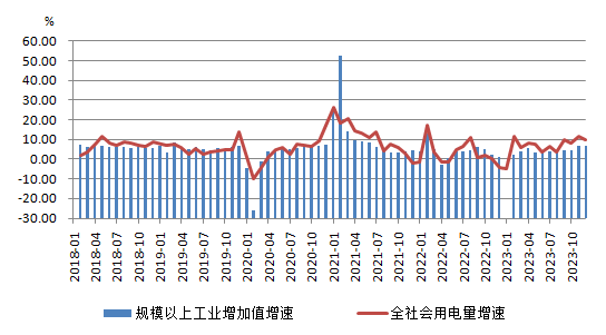 2023年,全社會用電量92241億千瓦時,同比增長6.7%,其中規(guī)模以上工業(yè)發(fā)電量為89091億千瓦時。從分產(chǎn)業(yè)用電看,第一產(chǎn)業(yè)用電量1278億千瓦時,同比增長11.5%;第二產(chǎn)業(yè)用電量60745億千瓦時,同比增長6.5%;第三產(chǎn)業(yè)用電量16694億千瓦時,同比增長12.2%;城鄉(xiāng)居民生活用電量13524億千瓦時,同比增長0.9%。根據(jù)已發(fā)布的2023年1—11月用電量數(shù)據(jù)推算,12月全社會用電量8563億千瓦時,同比增長10%,較11月回落1.6個百分點。