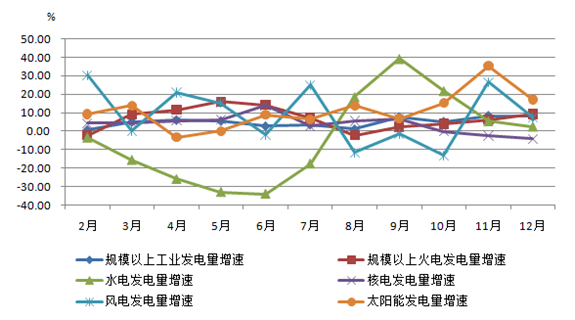 2023年,規(guī)模以上工業(yè)發(fā)電量8.9萬億千瓦時,同比增長5.2%。分品種看,規(guī)模以上工業(yè)火電增長6.1%,水電下降5.6%,核電增長3.7%,風(fēng)電增長12.3%,太陽能增長17.2%。12月份規(guī)上工業(yè)發(fā)電量8290億千瓦時,同比增長8.0%,增速比11月份放緩0.4個百分點,日均發(fā)電267.4億千瓦時。分品種看,12月份,規(guī)上工業(yè)火電增速加快,水電、風(fēng)電、太陽能發(fā)電增速回落,核電降幅擴大。其中,火電增長9.3%,增速比11月份加快3.0個百分點;水電增長2.5%,增速比11月份回落2.9個百分點;核電下降4.2%,降幅比11月份擴大1.8個百分點;風(fēng)電增長7.4%,增速比11月份回落19.2個百分點;太陽能發(fā)電增長17.2%,增速比11月份回落18.2個百分點。