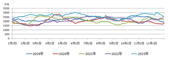 9月9日,環(huán)渤海九港庫存量合計2068.6萬噸,創(chuàng)年內(nèi)低點,隨后受港口封航影響,調(diào)出量下降,且因煤價持續(xù)上漲,港口調(diào)入量逐漸增加,終端接受度降低,港口庫存逐漸回升。進(jìn)入12月,北方港受寒潮影響封航增加。從12月8日到11日,秦皇島港口連續(xù)封航65.5個小時,港口調(diào)出量大幅減少,同時主產(chǎn)地因降雪影響,煤炭汽運拉運不暢,主要以鐵路發(fā)運為主,港口調(diào)入量變化不大。高調(diào)入低調(diào)出情況下,港口庫存快速增多,12月12日,秦皇島港口動力煤庫存升至738萬噸,創(chuàng)近5年新高。12月16日,北方九港庫存再次突破3000萬噸達(dá)3008.5萬噸,高于2022年同期755萬噸。2023年末隨著港口封航解除,調(diào)出量恢復(fù)至210萬噸以上高位,庫存下降明顯。截至12月31日,北方九港庫存回落至2609.2萬噸,其中秦皇島港庫存回落至566萬噸。