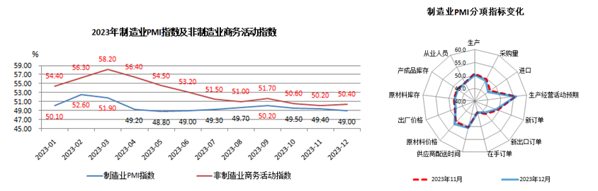 2023年制造業(yè)采購經(jīng)理指數(shù)(制造業(yè)PMI)全年均值49.9%,高于2022年全年均值0.8個百分點,全年經(jīng)濟呈現(xiàn)穩(wěn)定恢復(fù)、結(jié)構(gòu)向好發(fā)展態(tài)勢。從全年走勢看,一季度疫情影響消退后經(jīng)濟快速恢復(fù),制造業(yè)PMI運行在50%以上的較好水平;二季度需求快速釋放后經(jīng)濟回升勢頭有所放緩,指數(shù)較快回落;三、四季度各地積極落實穩(wěn)經(jīng)濟促增長等政策措施,指數(shù)均值在49.5%左右運行,顯示經(jīng)濟恢復(fù)的內(nèi)生動力仍需加強。2023年12月受部分基礎(chǔ)原材料行業(yè)生產(chǎn)淡季等因素影響,制造業(yè)采購經(jīng)理指數(shù)49.0%,比上月下降0.4個百分點,連續(xù)3個月處于枯榮分水線之下;非制造業(yè)商務(wù)活動指數(shù)50.4%,比上月上升0.2個百分點;綜合PMI產(chǎn)出指數(shù)50.3%,比上月微落0.1個百分點,表明我國經(jīng)濟總體產(chǎn)出景氣水平保持穩(wěn)定。