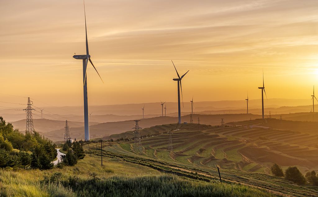 2024年7月26日,甘肅省定西市通渭縣,華家?guī)X梯田層層,風力發(fā)電機組佇立山頭。視覺中國圖