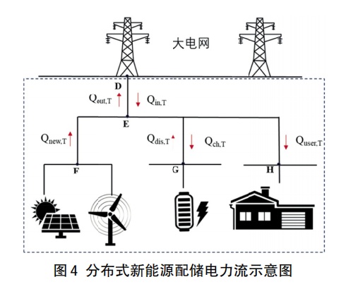 考慮儲(chǔ)能損耗的精確計(jì)量,在圖4中考慮周期T時(shí)間內(nèi)節(jié)點(diǎn)E的電量平衡,即Qnew,T+Qin,T+Qdis,T=Qout,T+Qch,T+Quser,T,這時(shí),新能源發(fā)電量可以用于用戶用電、儲(chǔ)能充電和上網(wǎng),下網(wǎng)電量可以用于用戶用電和儲(chǔ)能充電,在電量層面用戶用電量中難以區(qū)分由新能源發(fā)電量提供的部分和下網(wǎng)電量提供的部分,上網(wǎng)電量中也難以區(qū)分新能源發(fā)電提供的上網(wǎng)部分和下網(wǎng)電量經(jīng)過儲(chǔ)能重新上網(wǎng)的部分。