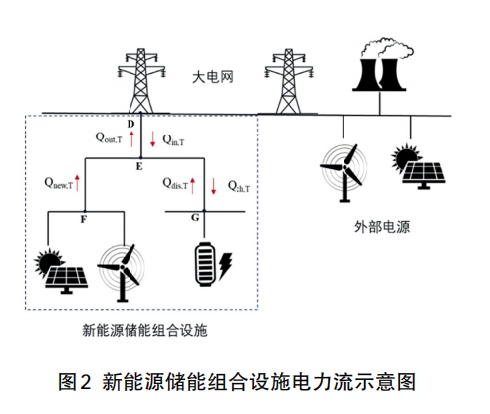 圖2展示了電源側(cè)新能源配儲(chǔ)與大電網(wǎng)交互的電力流,研究邊界是新能源和儲(chǔ)能結(jié)合的組合設(shè)施,新能源發(fā)出的電力直接送上電網(wǎng)或者流入儲(chǔ)能設(shè)施,大電網(wǎng)下網(wǎng)電力流入儲(chǔ)能設(shè)施,儲(chǔ)能設(shè)施放電送上電網(wǎng)。