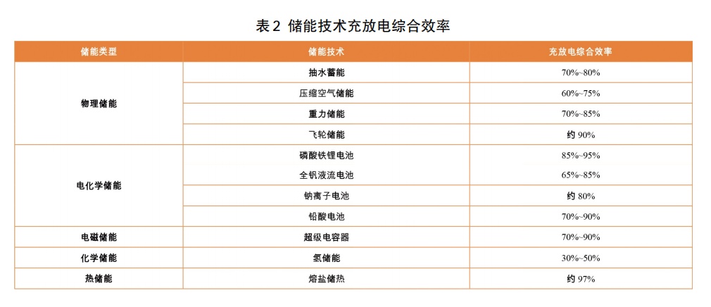 不同儲(chǔ)能技術(shù)的技術(shù)路線不同,充放電綜合效率也不相同,充放電綜合效率為考慮損耗后放電量和充電量的比值,反映儲(chǔ)能技術(shù)存儲(chǔ)能源的效率,表2給出了典型儲(chǔ)能技術(shù)的充放電綜合效率。從表2可以看出,不同儲(chǔ)能技術(shù)的充放電綜合效率差異較大,在30%到97%之間。